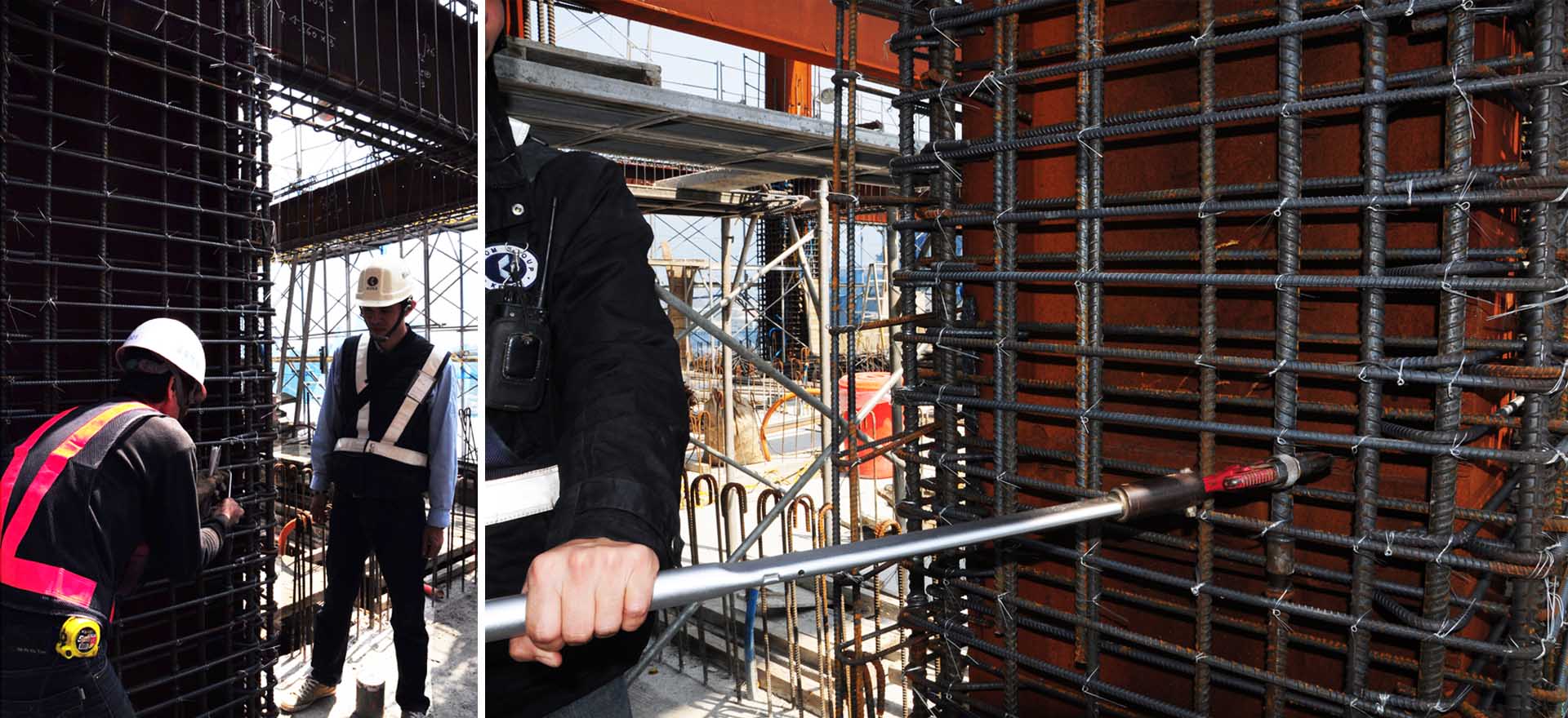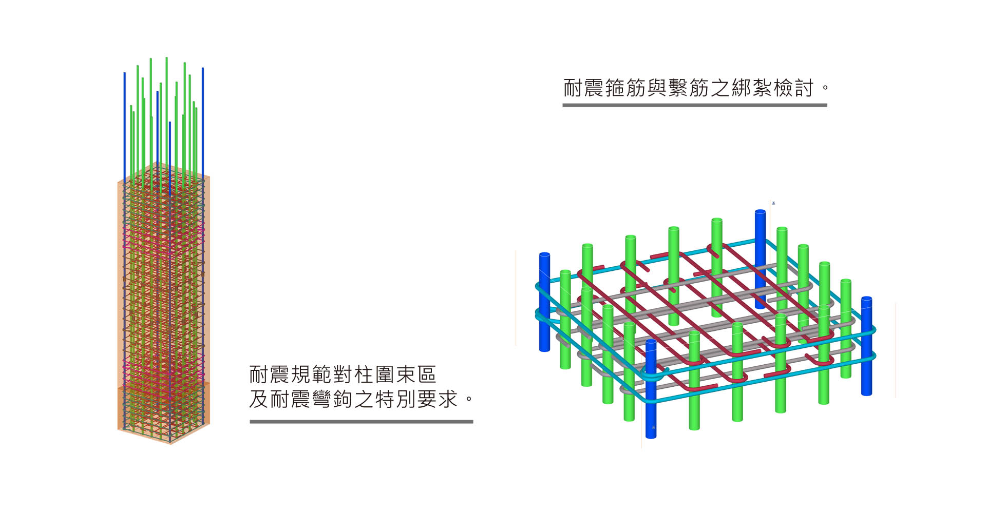 在鋼筋混凝土方面,我們會針對梁柱主筋的確認、續接器的檢查、箍筋繫筋的配置、鋼筋彎勾的角度,均是鋼筋施工的重點工作,尤其梁柱接頭區及柱圍束區,更是重點區域。建築物各個單一構件是否能有效抵抗地震力作用,就是取決於上述這著重點項目及區域。因此,必須確實依照耐震設計的要求施作。