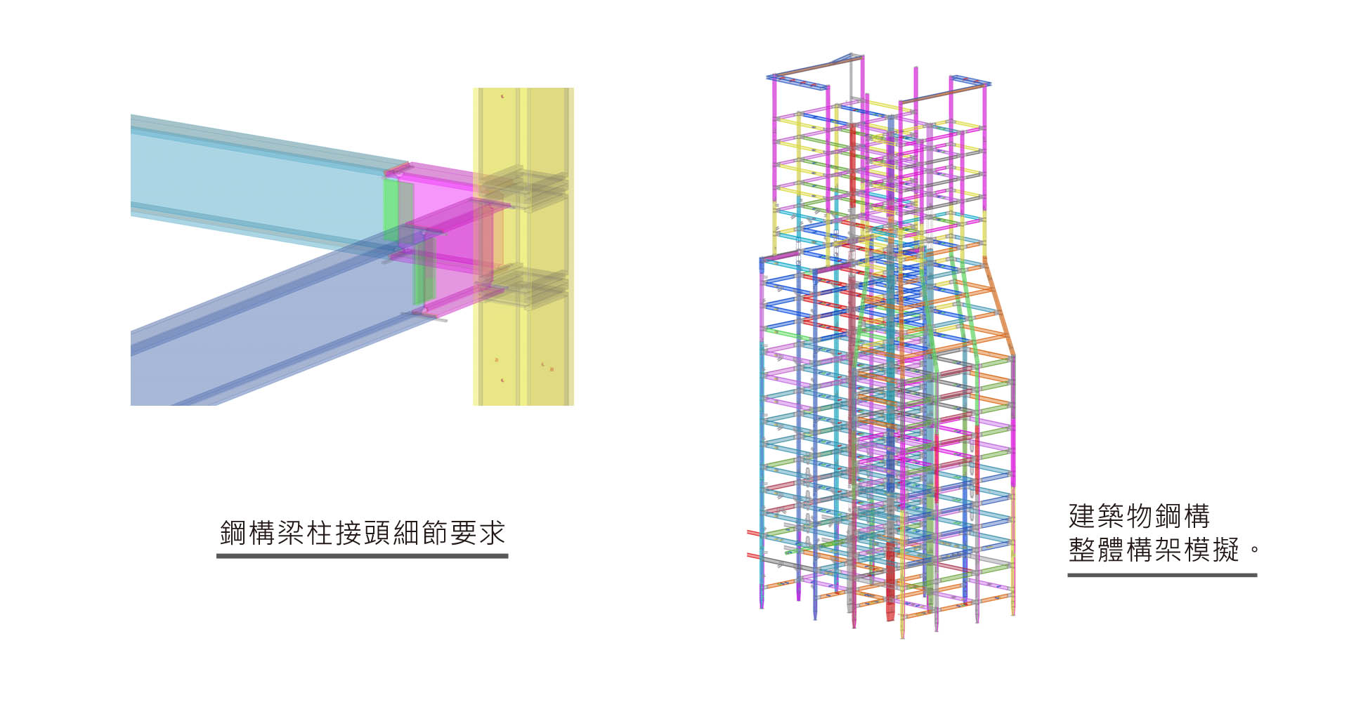 鋼構的梁柱接頭區域的施工品質,是直接影響抵抗地震的關鍵課題,所以不但施工前有整體構架的電腦模擬,更又針對每一處接頭焊接區域的形式、角度、切削都要先在電腦上建置出來,才能避免任何有礙到建築物耐震能力的因素。