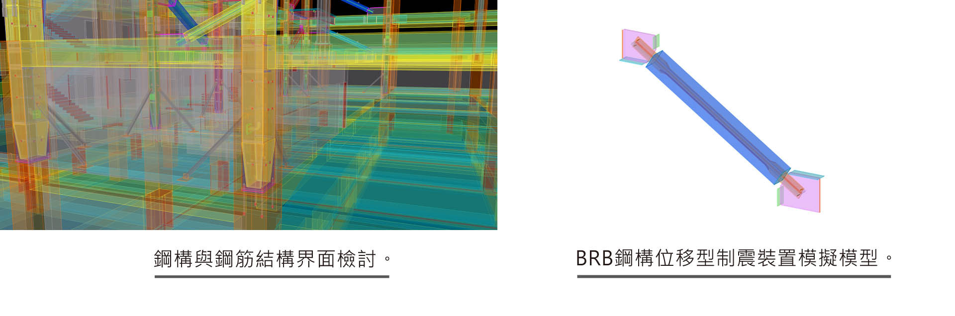 而特殊的部分如鋼骨與鋼筋混凝土的接合或者是特殊的BRB鋼構位移型制震裝置,更是要反覆觀察模擬模型,才能在施作時有最完美的工藝表現。