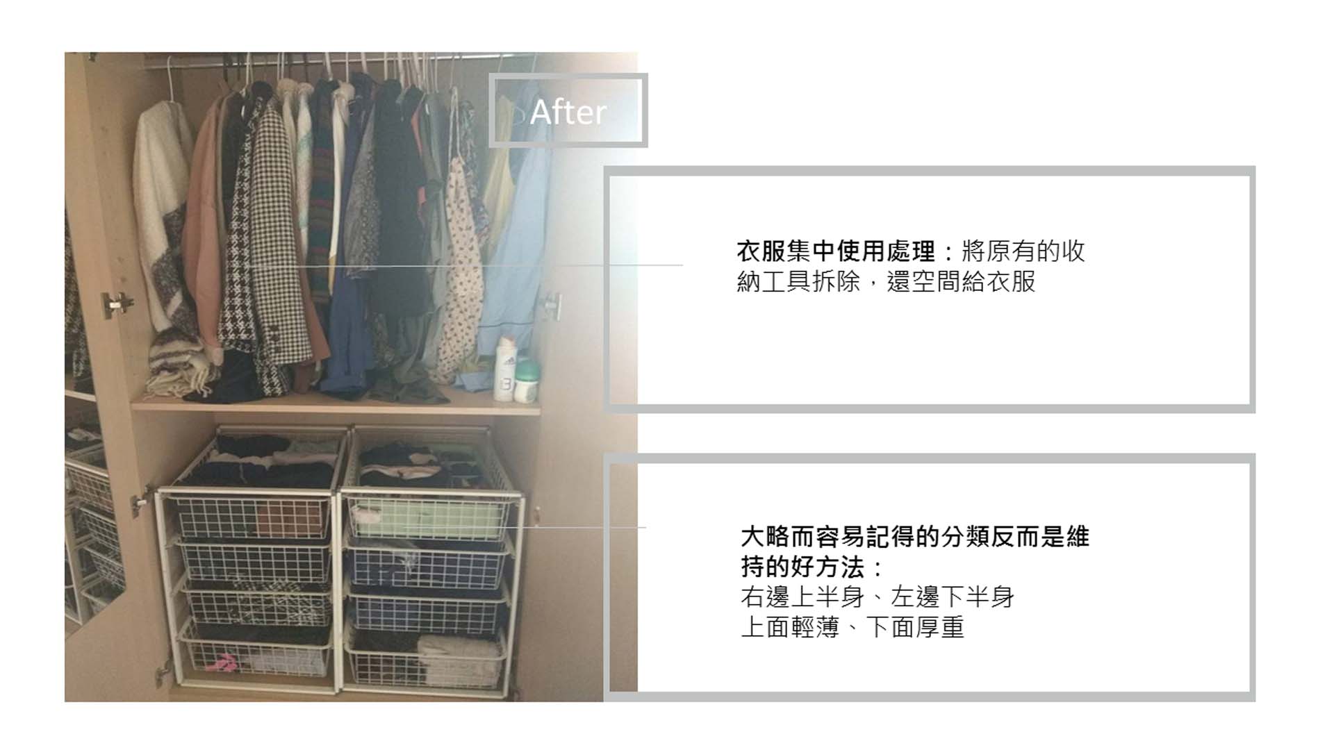 不過,斷捨離是不間斷的進行式作業,想要保持好習慣,賴庭荷傳授訣竅:「你就把衣服反掛,使用完你就正掛回去,使用完一段時間後,你就會慢慢發現,哪些衣服一直都是反掛的。」只要常穿與不常穿的衣服一目了然,更容易捨棄不需要的衣服,還原衣櫥空間真正該有的樣子,在整理的過程中,也能反覆整理自己的內心。