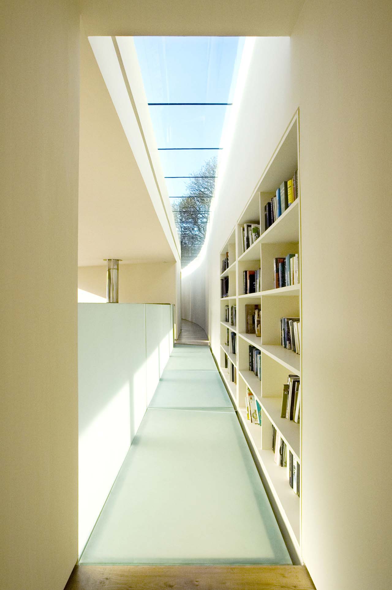 與大師設計有異曲同工之妙的,還包括將長廊的一側完全設計成書牆,或是將樓梯的一側以書櫃取代了扶手;甚至還有設計師做出更令人會心一笑的設計:起居室的牆面後方佇立著一小座樓梯,這梯不通往屋內的任何地方,只單單通向一面書架!