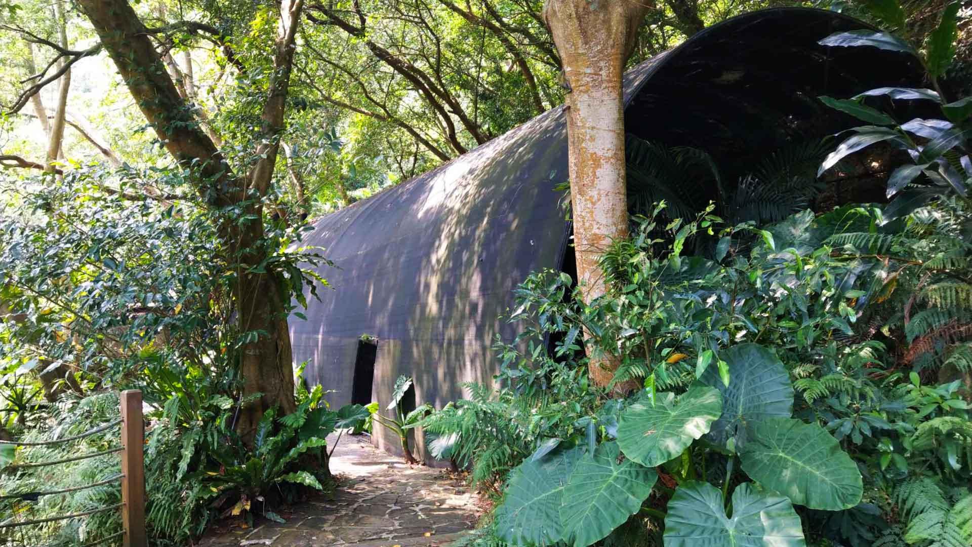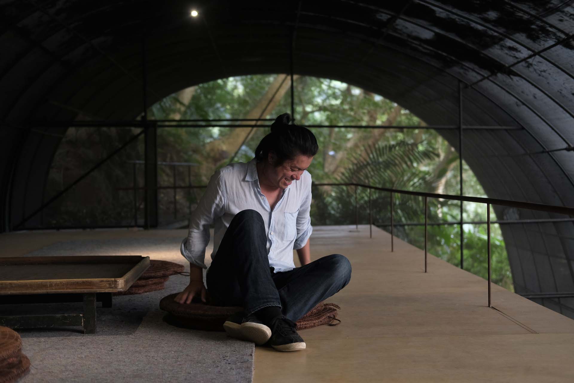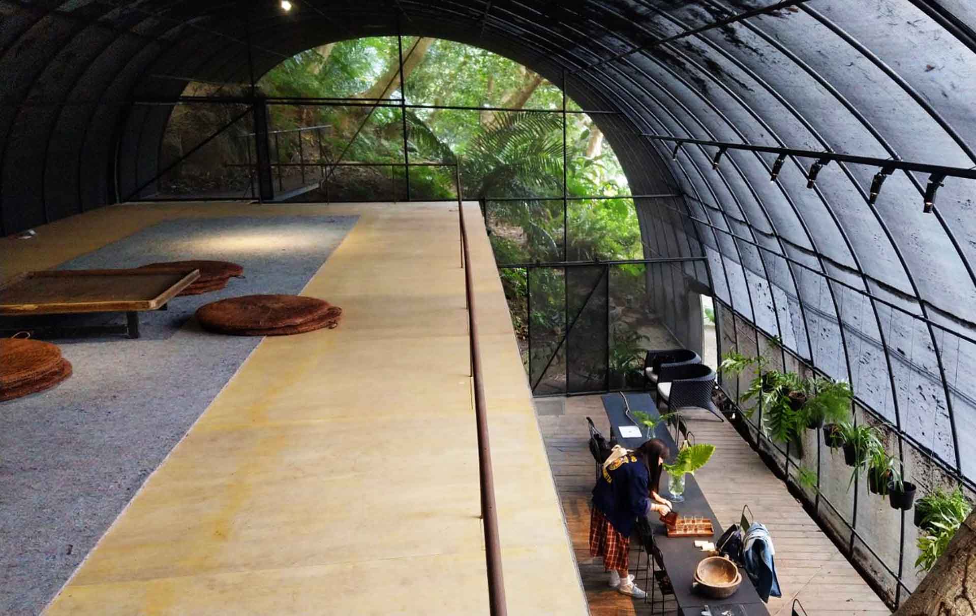 爬一小段陡坡,彎過幾折石階,來到隱匿在陽明山裡的少少(Siu Siu)。這個以「原始感覺研究室」為名的自然建築,是由自然洋行建築事務所擘畫興建——與其說這是一棟建築,不如說這是一棟類建築的農業設施——以錏管結構外覆黑網所形成的神祕溫室,坐落在原始山林層層包圍的中心,渾身上下散發出一種久違人跡的棄置感,這座建築自然到把「人」的干擾降到最低,就連拜訪者走進其中,也會不知不覺輕聲細語起來,就怕打擾了沉睡的森林。在這裡,自然才是建築的主角,而人類只是渺小的過客。