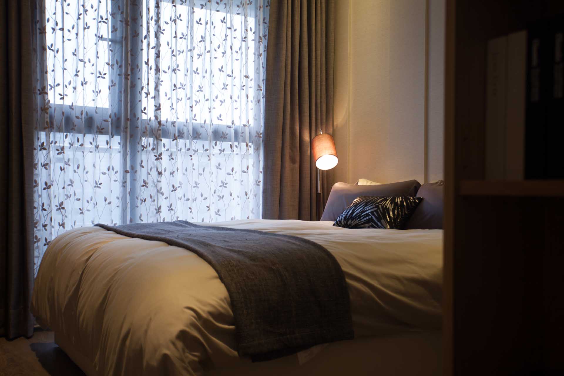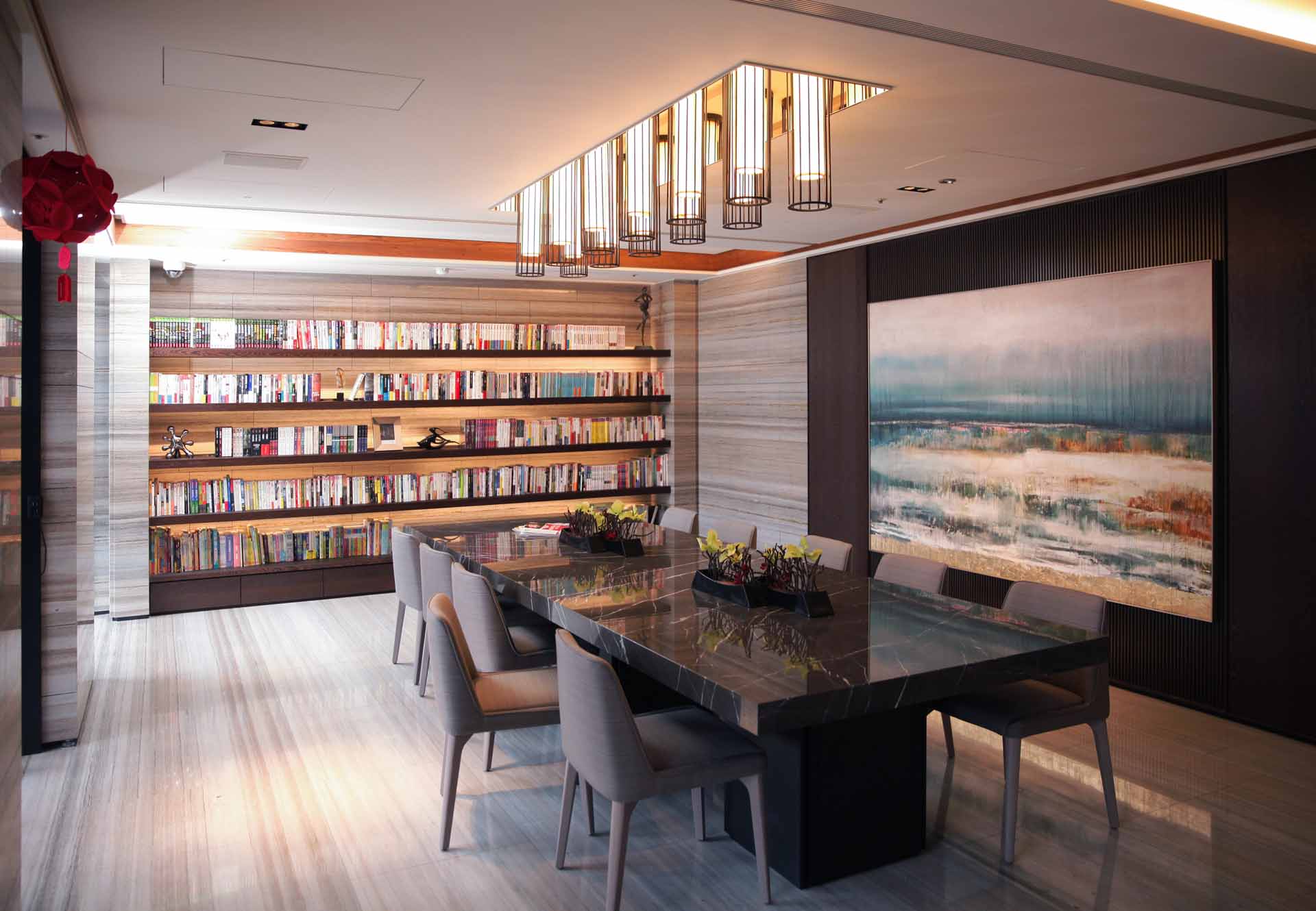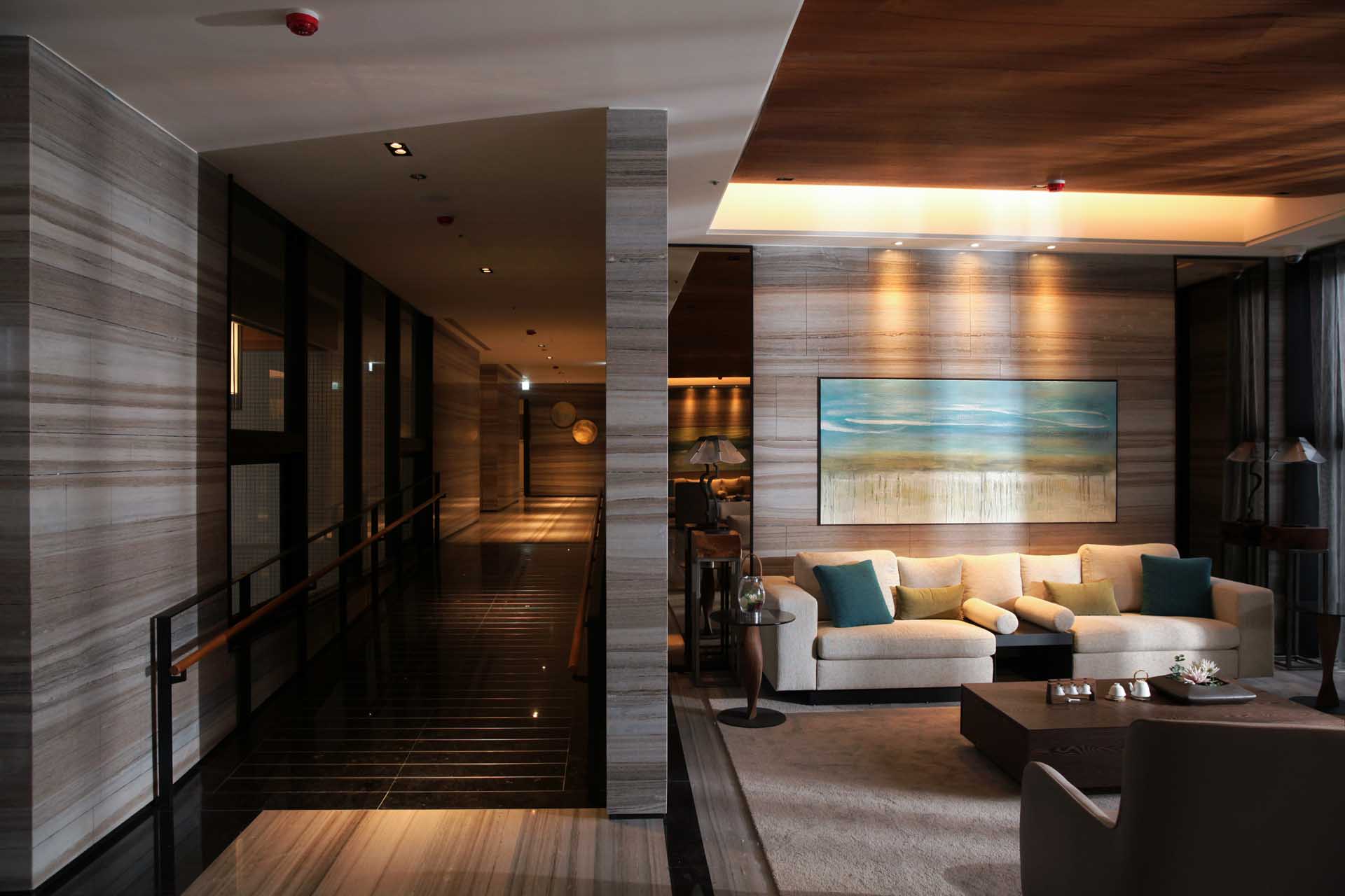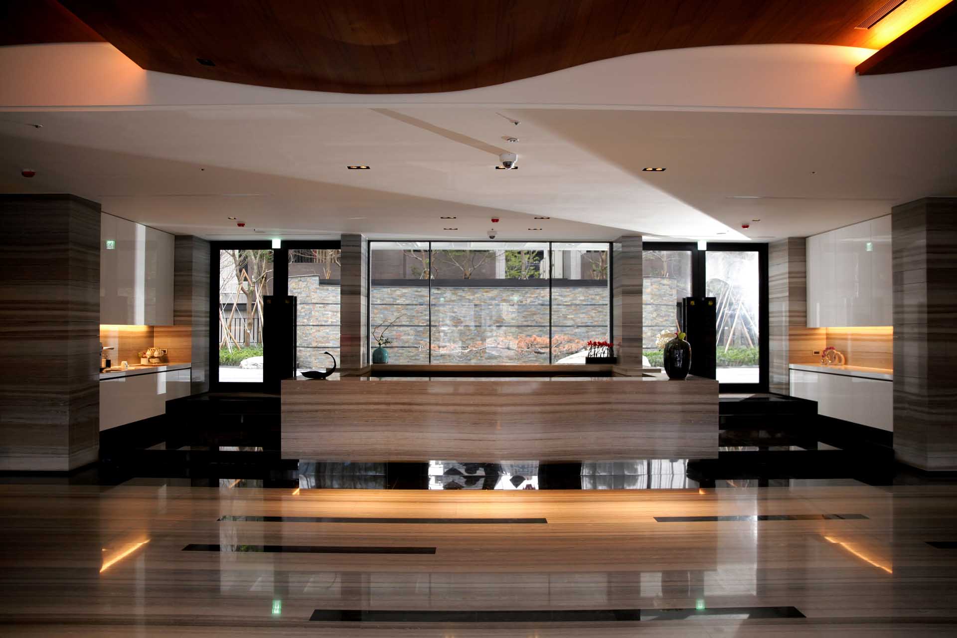 入門的挑高寬敞迎賓大廳,如同五星級飯店規格,使用大量高級石材,靈活運用在牆面和地面,搭配自然原色的木紋所設計波浪造型的天花板,營造一氣呵成的簡潔禪風,並以素樸、低調的飾品妝點,增添雅緻溫馨感受。迎賓櫃檯的降板設計,是令人眼睛為之一亮的巧思,讓進門的貴賓和住戶一眼就能看到後端的大片玻璃窗景,不會受到服務人員的遮蔽。而後端的香頌景觀花園建造了瀑布水幕,潺潺水流的自然美景,透過玻璃窗和夜晚燈光的映透下,就像是一幅巧奪天空的畫幕,創造綺麗絢爛的視覺效果。