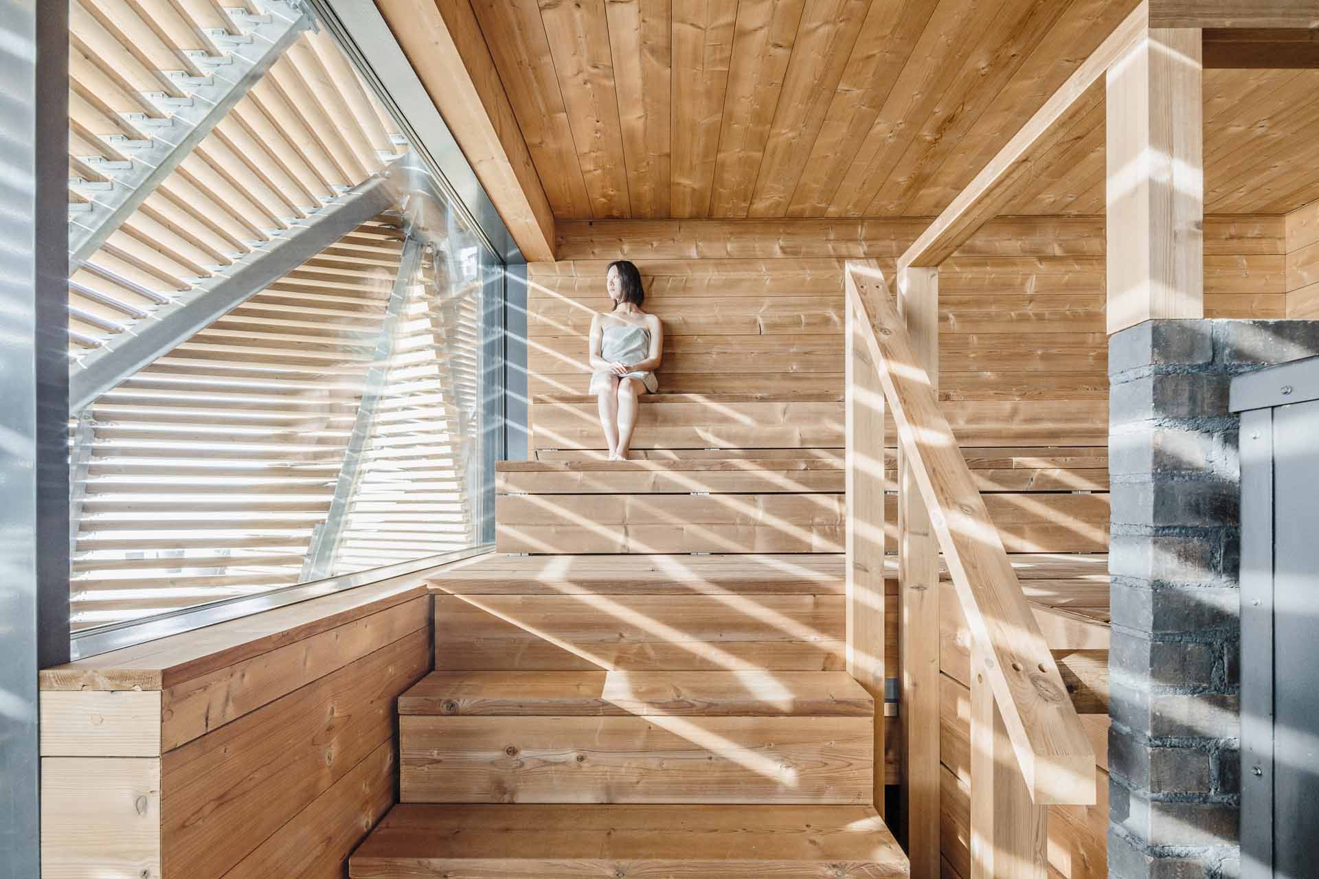 這座木造建築以不規則形狀攀附在岸邊,成為銜接陸地與海水的特殊媒介,而建築師將這種不規則形狀的外殼描述為「斗篷」(Cloak),它覆蓋了建築的主要兩個功能,一個是桑拿浴室,另一個則是餐廳區域。透過木頭結構的設計,這座公共桑拿同時兼具開放與私密,從建築內部可以無遮擋欣賞海景,但建築外部的視線卻無法穿透入內,而建築與棧道採用同樣素材,這也使得人們更能親近攀爬,將屋頂當成觀景平臺的一部分。