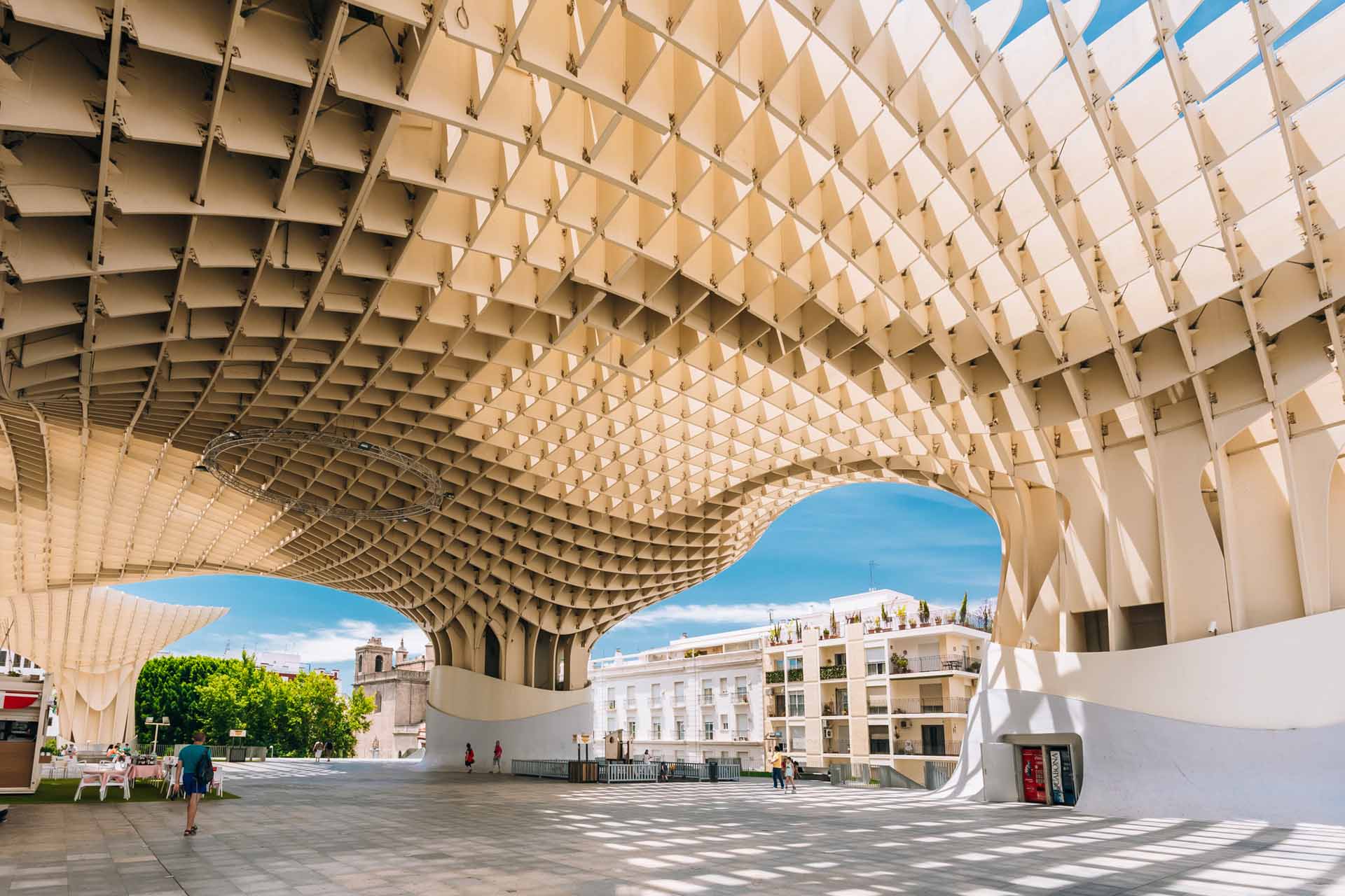 來到聞名世界的西班牙道成肉身廣場,二〇一一年由德國建築師于爾根.邁耶.赫爾曼(Jürgen Mayer-Hermann)在此設計的「都市陽傘」(Metropol Parasol),這座寬一百五十乘以七十公尺、高約二十六公尺的巨大蜂巢狀木構造,在當時號稱全世界最大的木建築,甫揭曉即掀起震撼,使得默默無聞的西班牙小鎮一夕成名。