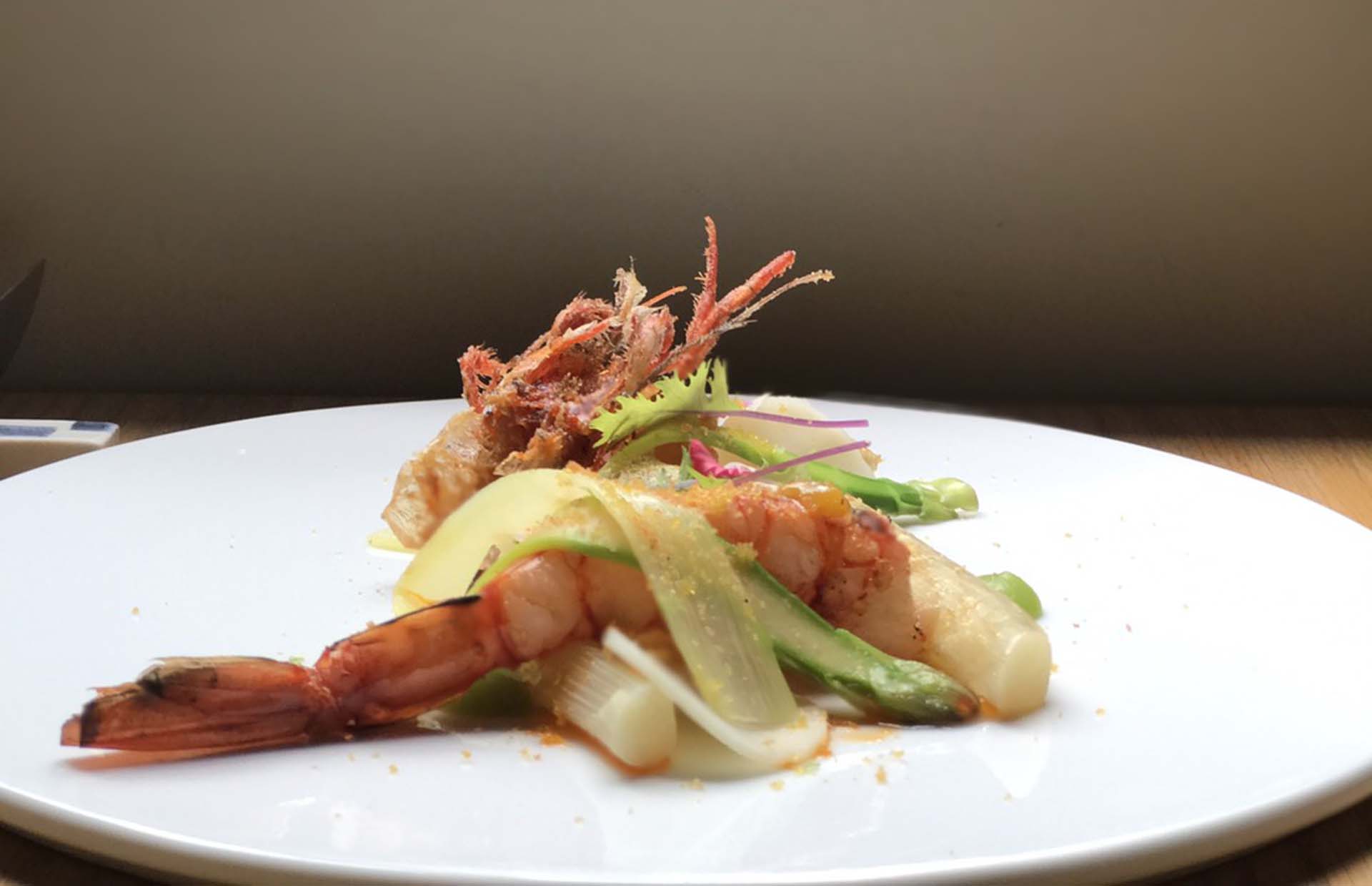 首先,這道菜是向廣東老菜「蘆筍百合蝦球」致敬。東港的胭脂蝦、土庫的白蘆筍、台中港的烏魚子,再加上自製的櫻花蝦粉、蝦膏泡泡,外表已然美如寶玉,內裡更是強調在地履歷與全力自製,這是他們的堅持,也是他們的玩心。