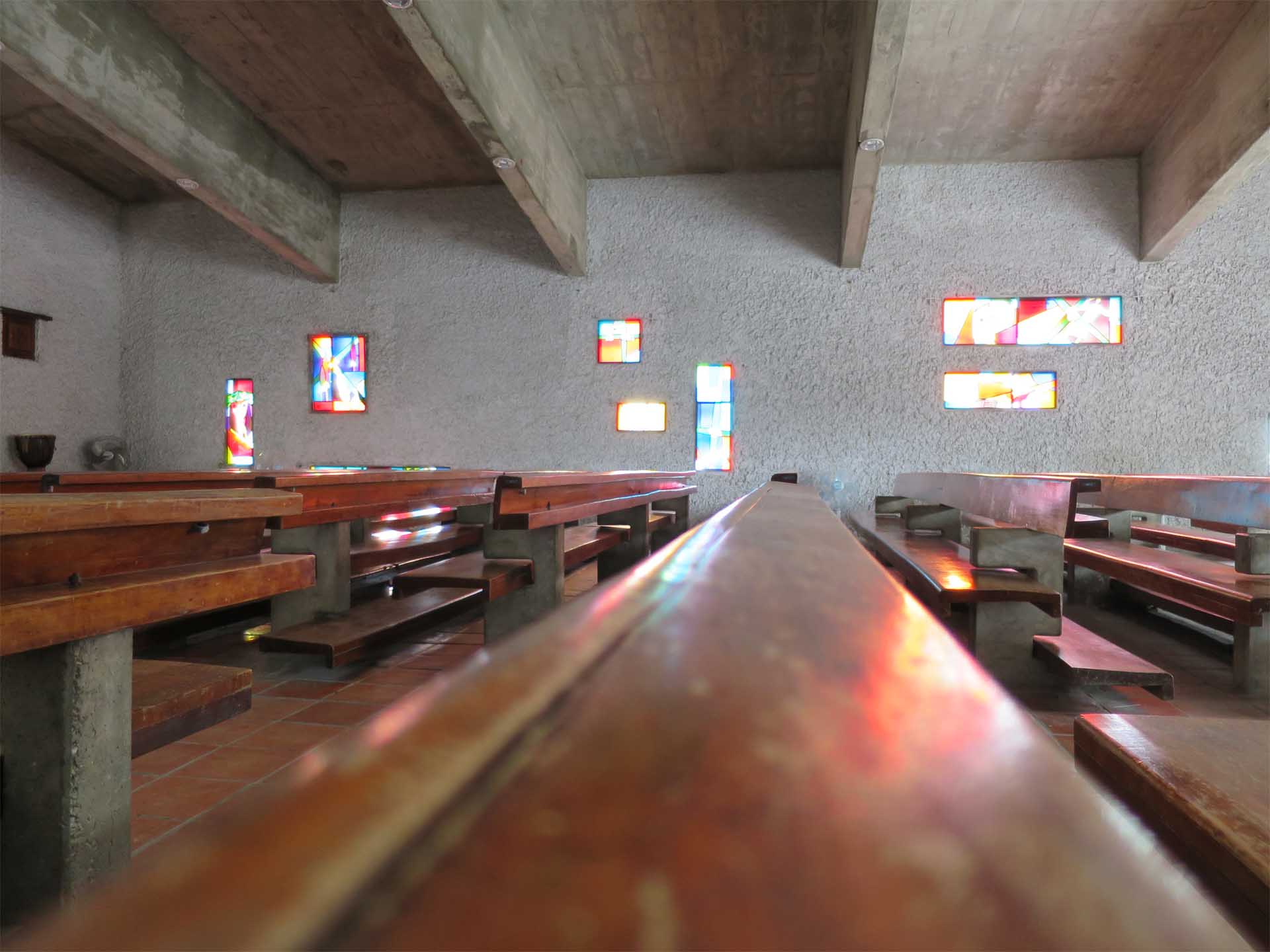 造訪的第一個點是公東高工。這是天主教白冷會的錫質平神父在一九五七年所創立的學校,讓當地居民有習得一技之長的機會,藉以改善生活。而讓每一位團員最為之稱奇的是,在五十多年前的台東偏鄉,竟可蓋出這樣一棟清水模的聖堂建築,甚且顧及排水、滴水線等細節;仿柯比意風格的窗洞,可通風、可透光,以當時工藝水準著實不易,更讓人對這群瑞士神父們肅然起敬。