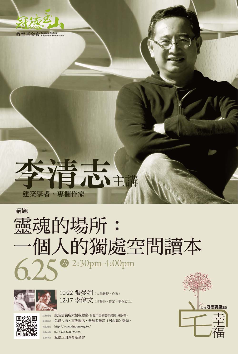 2016冠德講座【宅幸福系列】∣ 李清志《靈魂的場所:一個人的獨處空間讀本》開放報名!